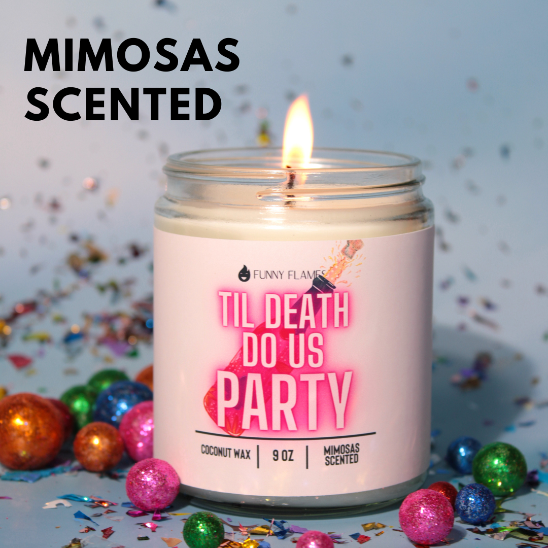 This candle that sets the mood for a celebration that never ends. Infused with the invigorating scent of refreshing mimosas, this candle fills the air with a delightful burst of citrus and champagne notes. Whether you're toasting to love, friendship, or life's precious moments, this candle encapsulates the spirit of joy and merriment. With its long-lasting burn and elegant design, 'Til Death Do Us Party' is the perfect companion for any gathering or intimate soirée, adding an enchanting touch to your space and leaving behind memories that last a lifetime.