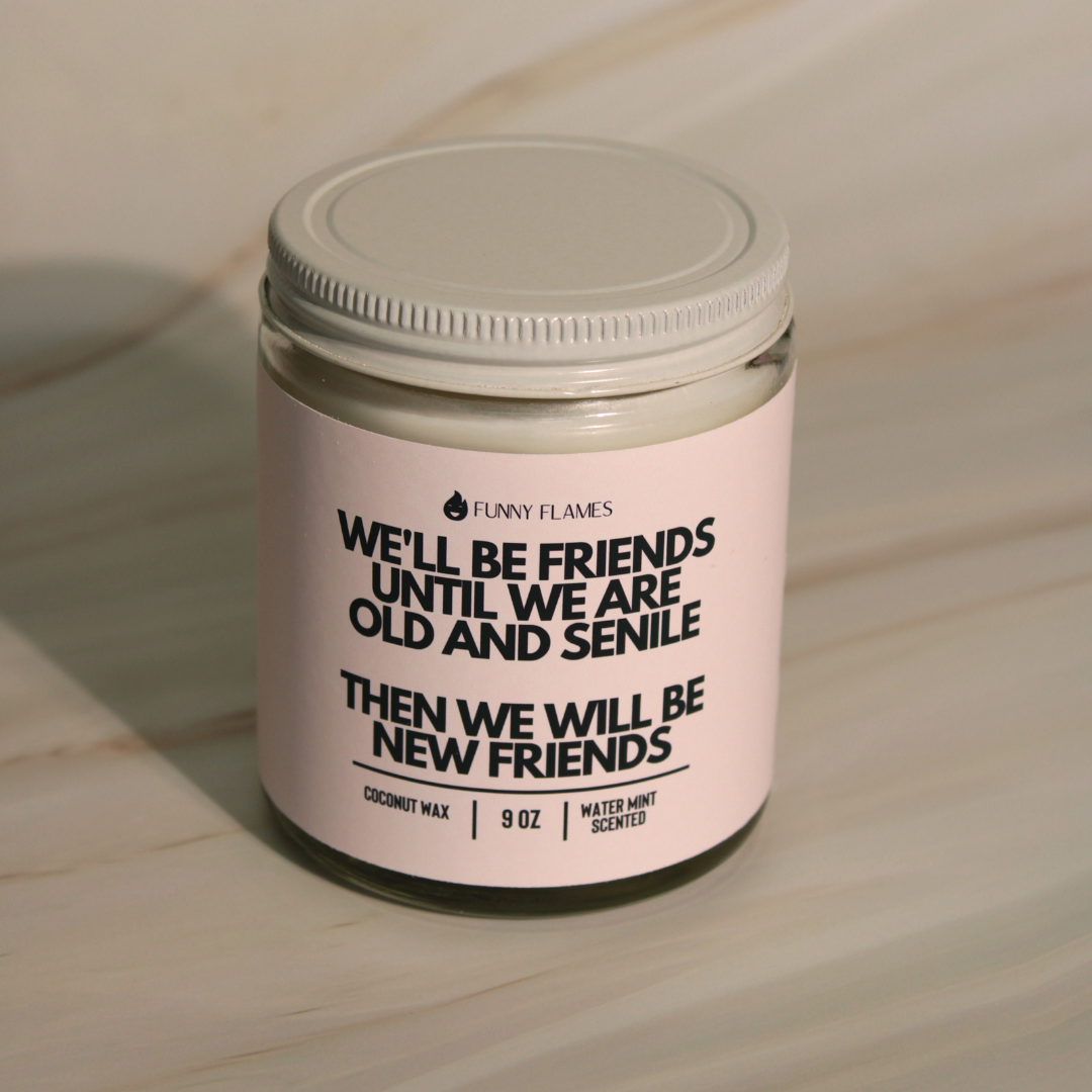 "We'll Be Friends Until We're Old And Senile" candle, crafted with a coconut apricot wax blend that's as smooth as our inside jokes and as sweet as the memories we'll laugh about when we're wrinkly and wise. Scented with the refreshing essence of watermint, this candle will have you reminiscing about all the hilarious adventures we've had and the many more to come!